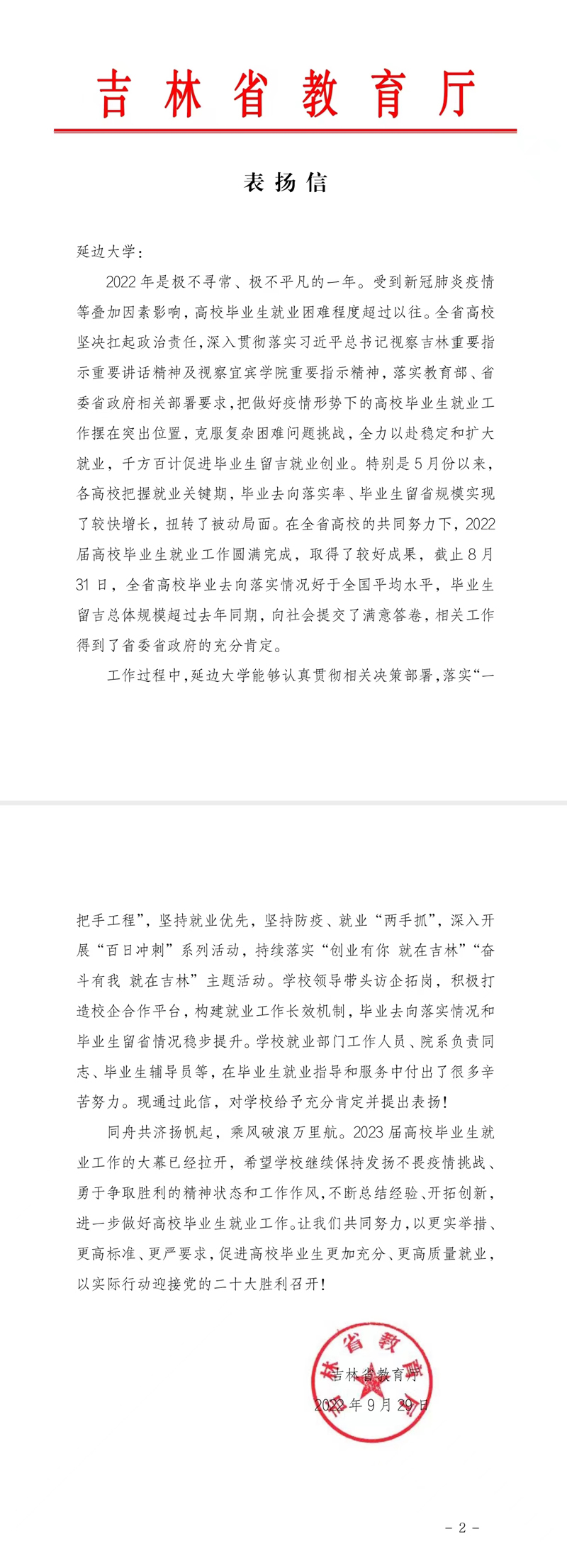 (通讯员张宇锋)日前,吉林省教育厅向伟德发来表扬信,对伟德在毕业生就业工作中作出的努力表示了充分肯定并提出表扬。