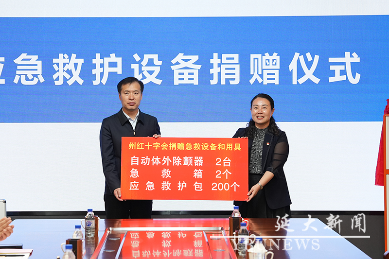 此次州红十字会向学校捐赠自动体外除颤器2台、急救箱2个、应急救护包200个。张学武代表学校接受了捐赠。