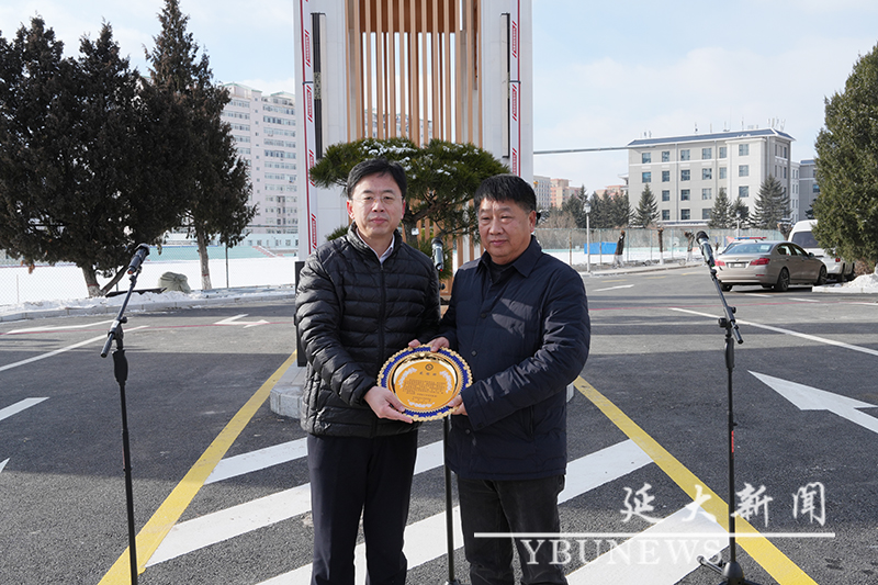 副校长金洪培向捐建方代表、吉林省弘方建设集团有限公司董事长徐辉胜赠送感谢牌