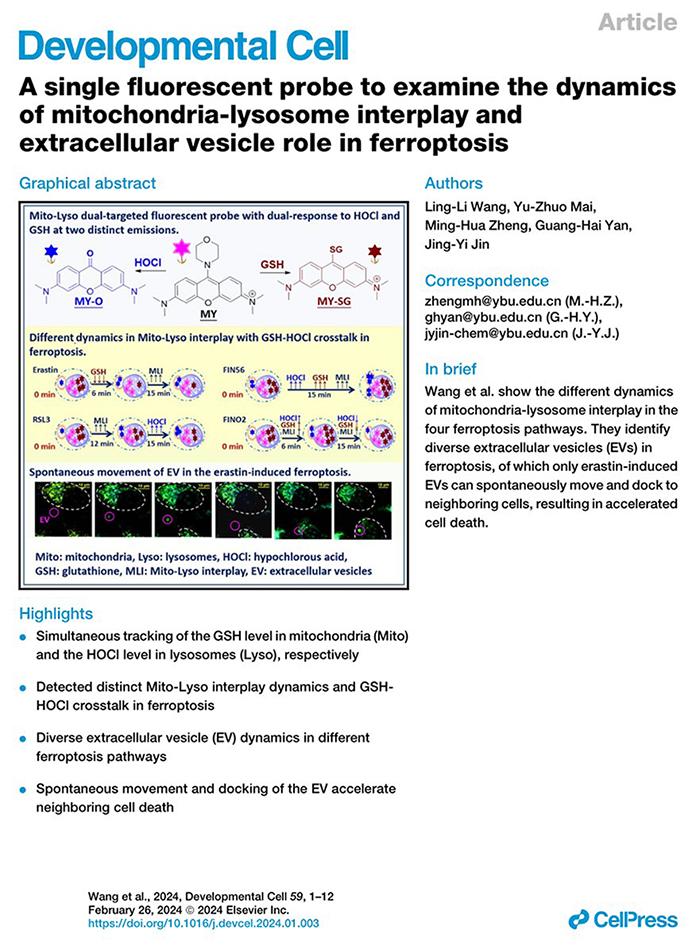 (科技处供稿)近日,伟德化学生物学研究中心金京一教授团队在Developmental Cell发表了题为A single fluorescent probe to examine the dynamics of mitochondria-lysosome interplay and extracellular vesicle role in ferroptosis的研究论文,开发了一个结构简洁的小分子荧光探针,揭示了细胞铁死亡过程中更多的动态细节。本研究是伟德首个独立完成的Cell子刊工作,化学生物学研究中心王翎力博士为第一作者,化学系郑明花副教授和医学院延光海教授为共同通讯作者。