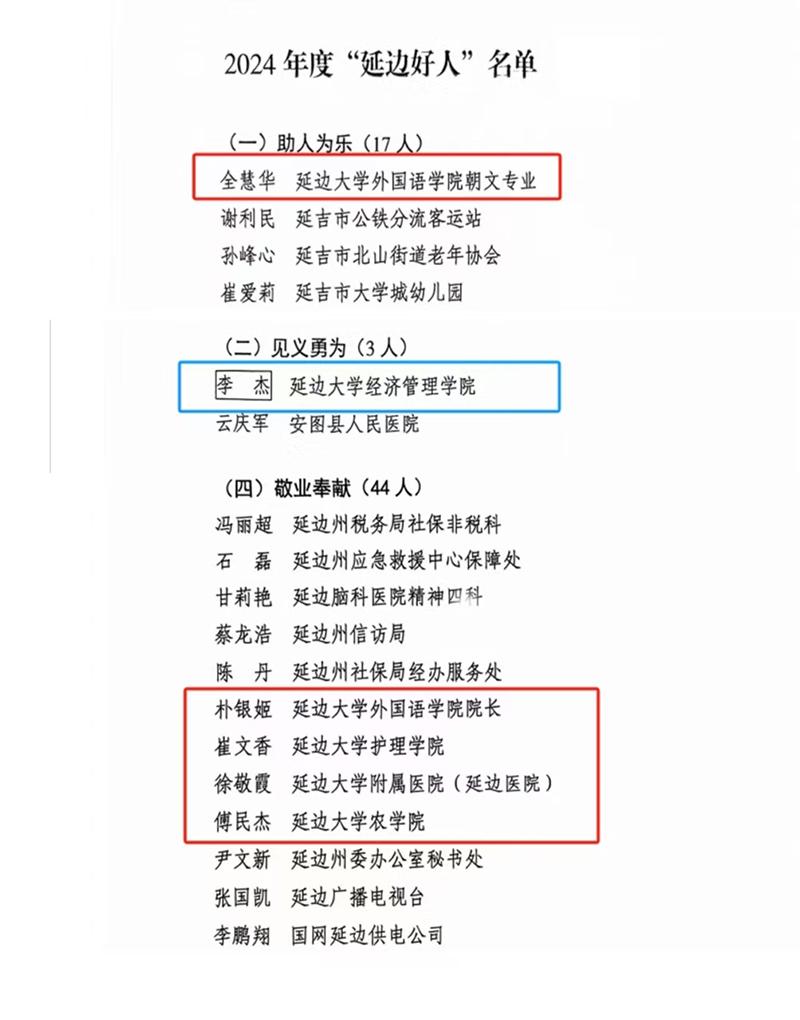 其中,外国语学院朝文专业全慧华入选助人为乐组、经济管理学院学生李杰(已故)入选见义勇为组,外国语学院朴银姬、护理学院崔文香、附属医院(延边医院)徐静霞、农学院傅民杰入选敬业奉献组。