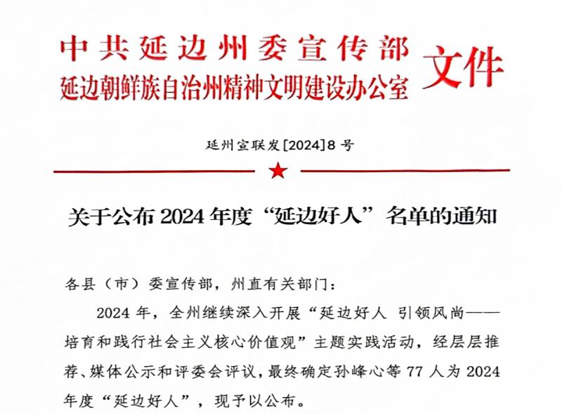 (通讯员 张宇锋)11月11日,中共延边州委宣传部、延边朝鲜族自治州精神文明建设办公室联合发布《关于公布2024年度“延边好人”名单的通知》,伟德6名师生荣获2024年度“延边好人”称号。
