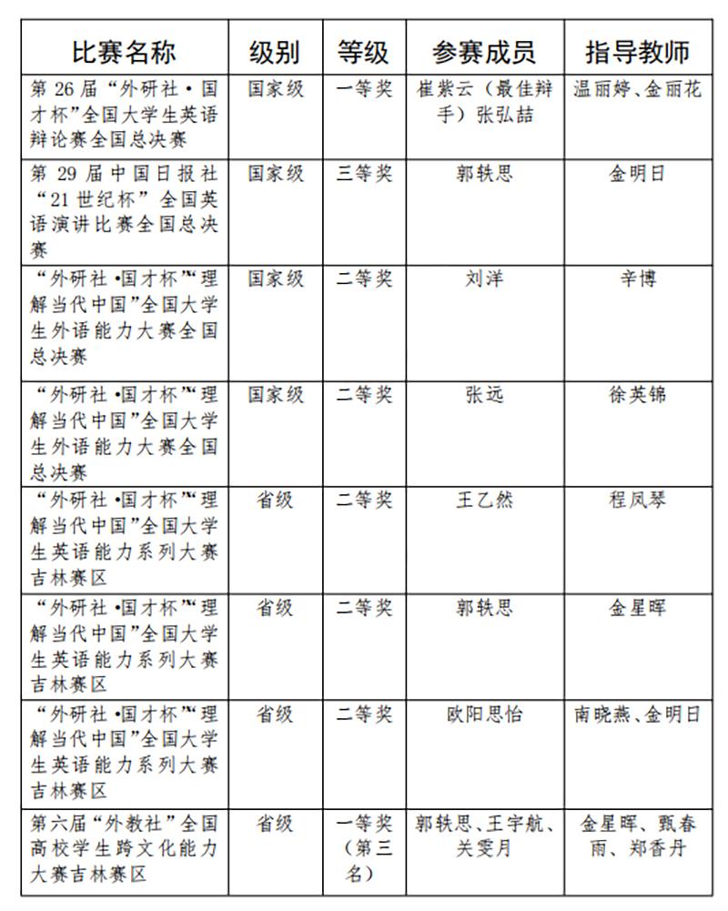 在第6届“外教社杯”全国高校学生跨文化能力大赛吉林赛区比赛中,由英语专业、日语专业、会计学专业3名同学组成的团队获得省赛一等奖(第三名)。