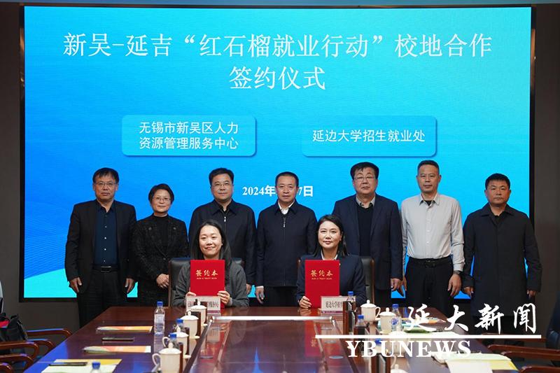 无锡市新吴区人力资源管理服务中心副主任王秋晨、学校招生就业处处长金鸿雁、无锡高新人才发展集团有限公司总经理周卫华、延吉国际合作技术学校副校长李仙花、延吉市职业高级中学副校长杜默作为部门负责人签订“红石榴就业行动”协议书。